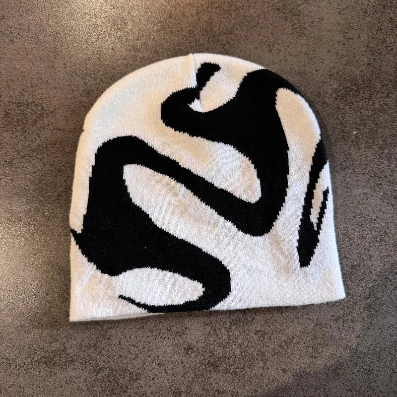 Our statement piece beanie. A bold hat, with warmth and style embedded in the fabric. The squiggles symbolize change in oneself, which is powerful, to not boast and bluster, and to be true to oneself